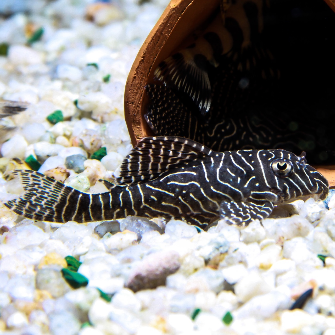 Zebra Pleco, also known by its scientific name Zebra Peckoltia, belongs to the family Loricariidae. This beautiful pleco lives upriver of the Altamira on the Xingu River in Brazil. This is one of the most beautiful plecos available in the hobby. The Zebra Pleco's body is spectacularly patterned in black and white (as its name suggests). It is considered by many, rightfully so, as the crown jewel of plecos in the hobby.